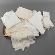 Divers antiek textiel, bestaande uit: diverse kraagjes, twee kanten schortjes, drie katoenen sloven, twee mutsjes, gebreide sok, acht nachtjaponnen, diverse kinderkleding en damasten tafellaken -verkleuringen, vlekken en gebruikssporen-