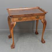 Notenhouten theetafel, het losse dienblad met opstaande rand en glazen blad, voorzien van lade, de gebogen poten eindigend in bolklauwpoten, de schouders van de poten met acanthusblad, naar 18e-eeuws voorbeeld, 20e eeuw -gebruikssporen, licht verkleurd-, 76 × 84 × 54 cm