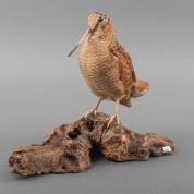 Opgezette vogel: houtsnip op boomstronk