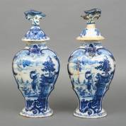 Paar Delfts aardewerk kastvazen met blauw-wit decor: man in landschap, uitvoering De Porceleyne Claeuw, gemerkt, tweede helft 18e eeuw -vele restauraties-, 40 × 18 × 14 cm