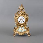 Klein verguld metalen klokje met beschilderd bloemdecor op turquoise achtergrond en geëmailleerde wijzerplaat met bloemguirlande en Romeinse cijferring, Louis Quinze-stijl, hoogte 40 cm