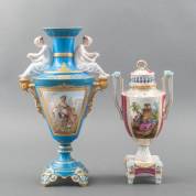 Porseleinen vaas met twee romantische voorstellingen en lezende dames, en porseleinen potpourrivaas, beide met defecten en herstellingen, hoogte grootste vaas 41 cm