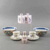 Paar aardewerk kommen, uitvoering Makkum, paar aardewerk theebussen -één deksel defect-, uitvoering Zenith, paar porseleinen kop-en-schotels, uitvoering Herend, en een aardewerk vaasje, afmetingen kommen 7,5 × Ø 18 cm