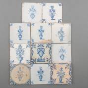 Elf aardewerk tegels met blauw-wit bloemenvaasdecor, 17e eeuw en later -één met gerestaureerde hoek, de rest met gangbare slijtages-