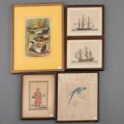 Vijf prenten, waaronder: fazanten, gesigneerd in de druk G. Mützel, Ottomaan, en halsbandparkiet -verkleuringen en vlekken-, fazanten 20,5 × 13,5 cm
