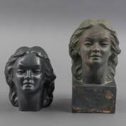 Twee aardewerk beelden: buste van dame met lang haar op basement, groengepatineerd, gesigneerd M. Cecconi, S.C.O. Orvieto, en groengeglazuurde buste van dame met lang haar, grootste 31 cm