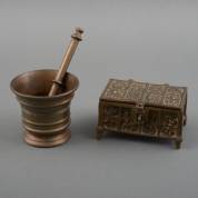 Messing reliekkistje met religieuze voorstellingen, Frankrijk, 19e eeuw, en bronzen vijzel met stamper, doosje 8 × 14 × 9 cm