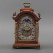 Wortelnotengefineerd tafelklokje met maanaanduiding, adres: Frans Hermle, tweede helft 20e eeuw -loopt goed-, 28 × 19 × 15 cm