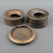Twee bronskleurig geglazuurde keramiek vazen met asymmetrische openingen en randen, en een handgevormde schaal met grillige opstaande rand, ontwerp Jaan Mobach, uitvoering Kunstaardewerkfabriek Mobach, Utrecht -enkele minieme chips-, 10 × 21 cm