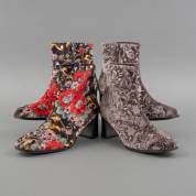 Twee paar enkellaarsjes met bloempatroon, uitvoering Gabor, het ene paar maat 7 en het andere maat 7½, maar in de praktijk lijken zij even groot