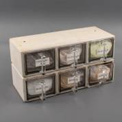 Witgelakt houten grutterskastje met zes glazen lades, ontwerp Piet Zwart, uitvoering Bruynzeel, jaren '50 -gebruikssporen, één lade afwijkend-, 24 × 46 × 18 cm, herkomst: Kruideniersmuseum Utrecht