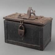 Smeedijzeren geldkistje, met hangslot en inwendig slot, 19e eeuw -plekje in deksel doorgeroest-, 19 × 30,5 × 18,5 cm