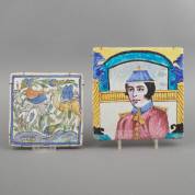 Twee Perzische aardewerk tegels, de één met een portret van een man, de ander met twee kamelen met bepakking, Qajar-periode, 19e eeuw -randschilfers-, 24 × 24 cm