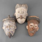 Drie beschilderde Afrikaanse houten maskers, waarvan één met beweegbare onderkaak, Punu, Gabon, 20e/21e eeuw, 25 × 19 cm