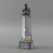 Corry Ammerlaan-van Niekerk (1947), kleine bronzen buste van Pim Fortuyn, achterop gemonogrammeerd, staand op aardewerk basement met motto 'Loquendi Libertatem Custodiamus' -chip van basement-, kopie naar het grote beeld in Rotterdam, 29 × 8 × 8 cm