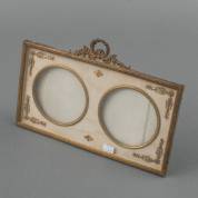 Dubbele fotolijst met twee ronde medaillons in rechthoekige messing lijst bekroond door strikornament, Louis Seize-stijl -stukje van achterplaat ontbreekt-, 15 × 27,5 cm