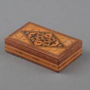 Tunbridgeware doosje met ruitvormig inlegwerk, gemerkt met sticker à la mosaique perfectionnée, Stiffa, Menton, Frankrijk, begin 20e eeuw -twee kleine stukjes fineerverlies, lichte schade aan het deksel, 13,5 × 8,5 × 3,5 cm