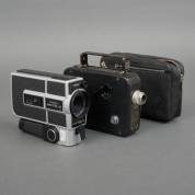 Filmcamera in zwarte metalen behuizing, Cine-Kodak Eight Model 25, 8 mm, uitvoering Eastman Kodak Company, USA, en filmcamera, Super UXL-1.1, 8 mm, uitvoering Yashica, Japan, met beschermtas -beide met gebruikssporen-, 17 × 11 cm