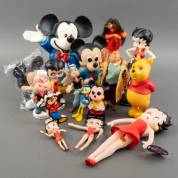 Verzameling kunststof figuren, waaronder: diverse Mickey Mouse poppen en lamp, Kuifje, en Betty Boop poppen -gebruikssporen-, lamp 31 × 27 × 16 cm