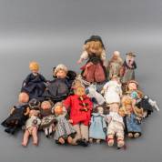 Verzameling oude klederdrachtpopjes en winkelpopjes, etc., diverse afmetingen en leeftijden -van enkele is de kleding sleets, niet alle kledingoutfits compleet-, 30 cm