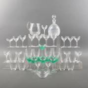 Kristallen drinkservies, model Julien Sirene, ontwerp Willem Jacob Rozendaal, uitvoering Kristalunie Maastricht, bestaande uit: acht wijnglazen met groene kelk, vijf wijnglazen met heldere kelk, vijf kleinere wijnglazen, één karaf, één waterkan met zes waterglazen, zes kleinere glazen, drie coupes, zes jeneverglaasjes en één kommetje -lichte gebruikssporen, karaf met aanslag-, hoogte grootste karaf 25 cm