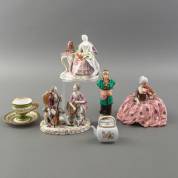 Divers porselein: beeldengroep met twee musicerende figuren, beeldengroep van dame in fauteuil met spinnewiel, model 2685, nr. 122, uitvoering Meissen, vioolspelende dame, Italië, figuur getiteld: 'Tilla Durieux', Limoges kop-en-schotel, decor Philippona 's Gravenhage, en Meissen trekpotje met floraal decor -defecten en herstellingen-, Meissen beeldengroep 16 × 16 × 12 cm