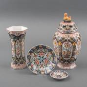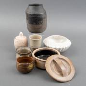Rakugestookte keramiek dekseldoos, wit keramiek vaasje met ruitdecor op de rand, bruingeglazuurde dekseldoos, twee kommen, beker op voet en zwarte rakugestookte vaas, 18 cm