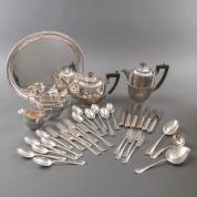 Verzilverd dienblad, driedelig verzilverd koffieservies, verzilverde theepot -hengsel met barst- en zespersoons verzilverde bestekgedeelte, Hollands glad, Keltum -twee kleine vorken missend-, hoogte koffiepot 21,5 cm