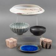 Divers keramiek, waaronder: grote wit-bruin geglazuurde schaal, gecraqueleerde kom en twee raku vierkante dekseldoosjes, gesigneerd en gedateerd EVA '91, schaal 6 × Ø 33 cm