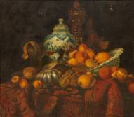 Hollandse School: stilleven met vruchten en vaatwerk op een Smyrna-tapijt, kopie naar Simon Luttichuys (1610-1662), olieverf op doek, gemaroufleerd, 19e eeuw -vlekken, vuil-, 98 × 112 cm