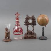 Divers kleingoed, bestaande uit: Boheemse kristallen karaf, globe op houten voet met kompas, borrelglaasje in houten Schwarzwald voet, gesneden met beer, zakhorloge in houten Schwarzwald voet gesneden met bomen en hert, globe 21 cm