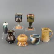Divers keramiek: twee bekers op voet, beker met oor, schenkkannetje, vaasje, bloempotje, en dekseldoosje, hoogte beker 14 cm