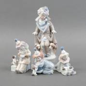 Vier porseleinen beeldjes: clowns met honden, model 5277, 5278, 5279 en 5901, uitvoering Lladró, grootste 25 cm