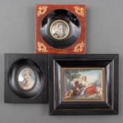 Drie miniatuurschilderijtjes: pastorale scene met verliefd stel, gravure met voorstelling van dame in 15e-eeuwse kledij, en voorstelling van Joséphine de Beauharnais, die laatste 20e eeuw, pastorale scene inclusief lijst 13,1 × 15 cm
