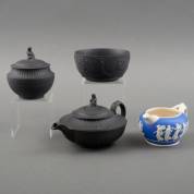 Basaltware theepot -tuit gerestaureerd-, suikerpot en kom, alle drie uitvoering Wedgwood, daarbij: jasperware roomkan, uitvoering Copeland