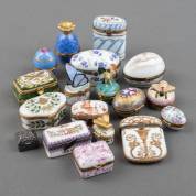 Verzameling kleine porseleinen dekseldoosjes, veelal gefabriceerd in Limoges, tweede helft 20e eeuw, en een 1e gehalte zilveren doosje