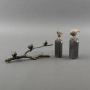 Drie bronzen beeldjes: drie vogels op tak, gemonogrammeerd RG, en twee gepatineerde vogeltjes elk op hardstenen basement, 20e eeuw, tak 11 × 37 × 13 cm