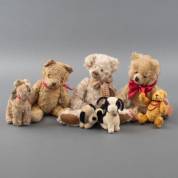 Drie mohair beren, waaronder een oud exemplaar, drie mohair hondjes en kleine beer, diverse leeftijden -speelsporen-, oude beer 33 cm