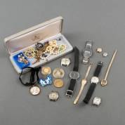 Diverse bijouterieën, horloges en drie herdenkingsmunten