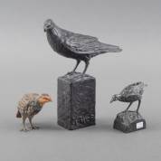 Drie bronzen beelden: 'De Raaf', gepatineerd, gemonogrammeerd EV, vogel, gepatineerd, gesigneerd en gedateerd Els de Veen '92, en polychroom beschilderde patrijs, niet gesigneerd, raaf 23,5 × 9 × 22 cm