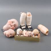 Losse biscuit en papier-maché poponderdelen, grootste poppenhoofd 18 cm
