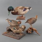Geprepareerde vogels: eend op houten basement, paar wintertallingen op houten basement, en een patrijs op boomstronk, eend 21 × 29 × 36 cm