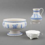 Jasperware kom en kannetje, en porseleinen kommetje met bladvormig reliëf, alle uitvoering Wedgwood, kom 13 × Ø 21 cm