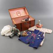 Miniatuur poppenhutkoffer met inhoud, 19e eeuw -gebruikssporen-, 24 × 35 × 22 cm