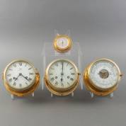 Twee diverse scheepsklokken Schatz Royal Mariner de wijzerplaat met Romeinse cijferring, aan- en uitschuif voor slagwerk -uurwerken dienen nagekeken te worden-, en scheepsbarometer Schatz, daarbij: kleine scheepsbarometer, adres: L.J. Harri, Amsterdam, alle in messing kasten, Ø grote barometer 15,5 cm