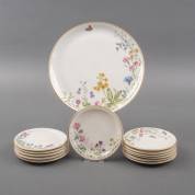 Porseleinen taartschaal en twaalf schotels met polychroom decor: Wiesengrund und Bergeshöhn, uitvoering Krautheim, Duitsland, Ø 28,5 cm