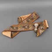Met kralen geborduurd schellekoord met latoenkoperen ornamenten en Boheems glazen greep, 19e eeuw -voering deels vergaan, defecten-, lengte 215 cm
