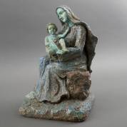 Blauwgeglazuurd keramisch beeld: Maria met kind, achterop gemonogrammeerd BR, tweede helft 20e eeuw, 43 × 28 × 28 cm