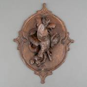 Gesneden houten wandplaquette met jachttafereel: twee vogeltjes, eikentak, kruithoorn, geweer, Schwarzwald, 19e eeuw -meermaals gelijmd-, 48 × 35 × 9 cm