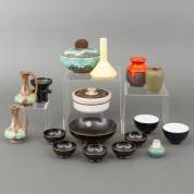 Divers plateel en keramiek: twee dekselschalen, pindaset met vijf bakjes, paar vaasjes, en diverse vaasjes en bakjes, hoogste vaasje 14 cm